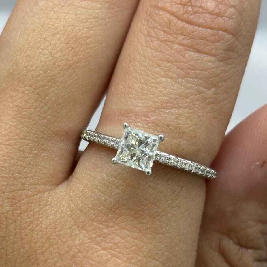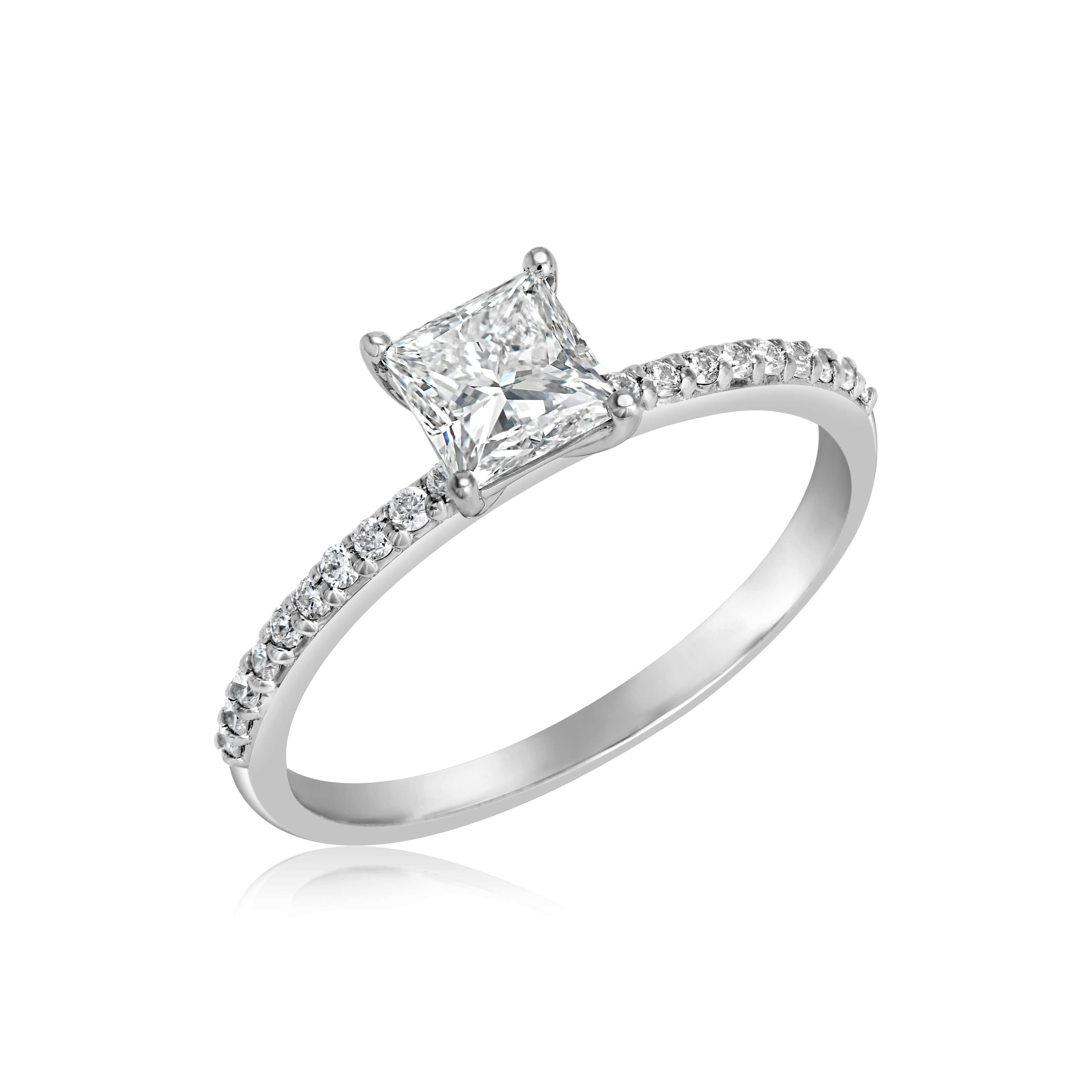 טבעת אירוסין משובץ יהלום מרכזי בחיתוך פרינסס מרובע מוקף יהלומים קטנים לאורך החישוק למראה יוקרתי ומנצנץ.