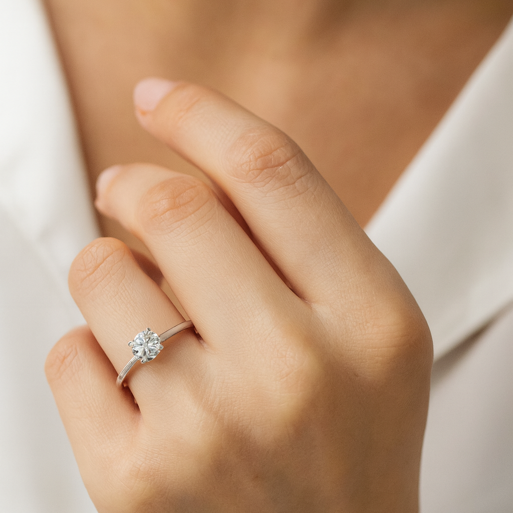 טבעת אירוסין עם יהלום מרכזי עגול ומרשים בעל מראה נקי שמתאים למי שמחפש טבעת אלגנטית.
