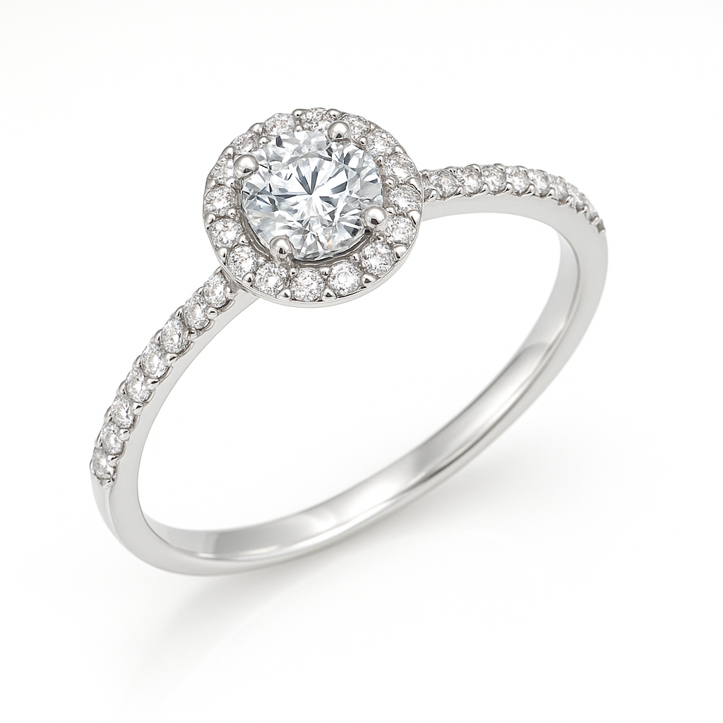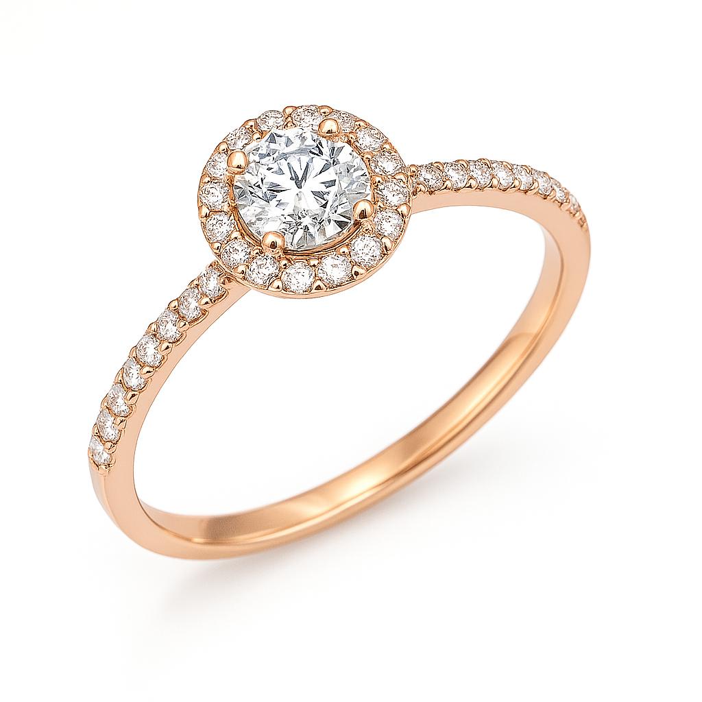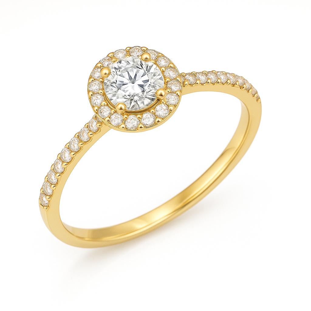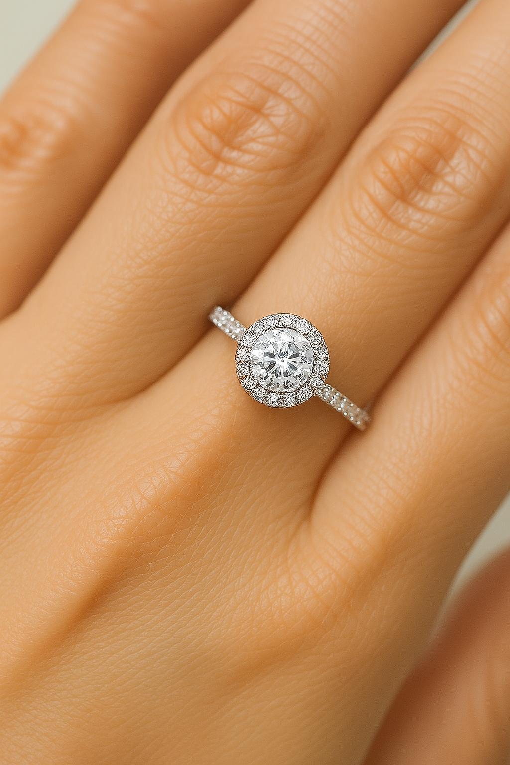 טבעת עם יהלום מרכזי ויהלומי צד ומסגרת עדינה של יהלומים המקיפה את היהלום המרכזי, מה שמעניק לטבעת מראה אלגנטי.