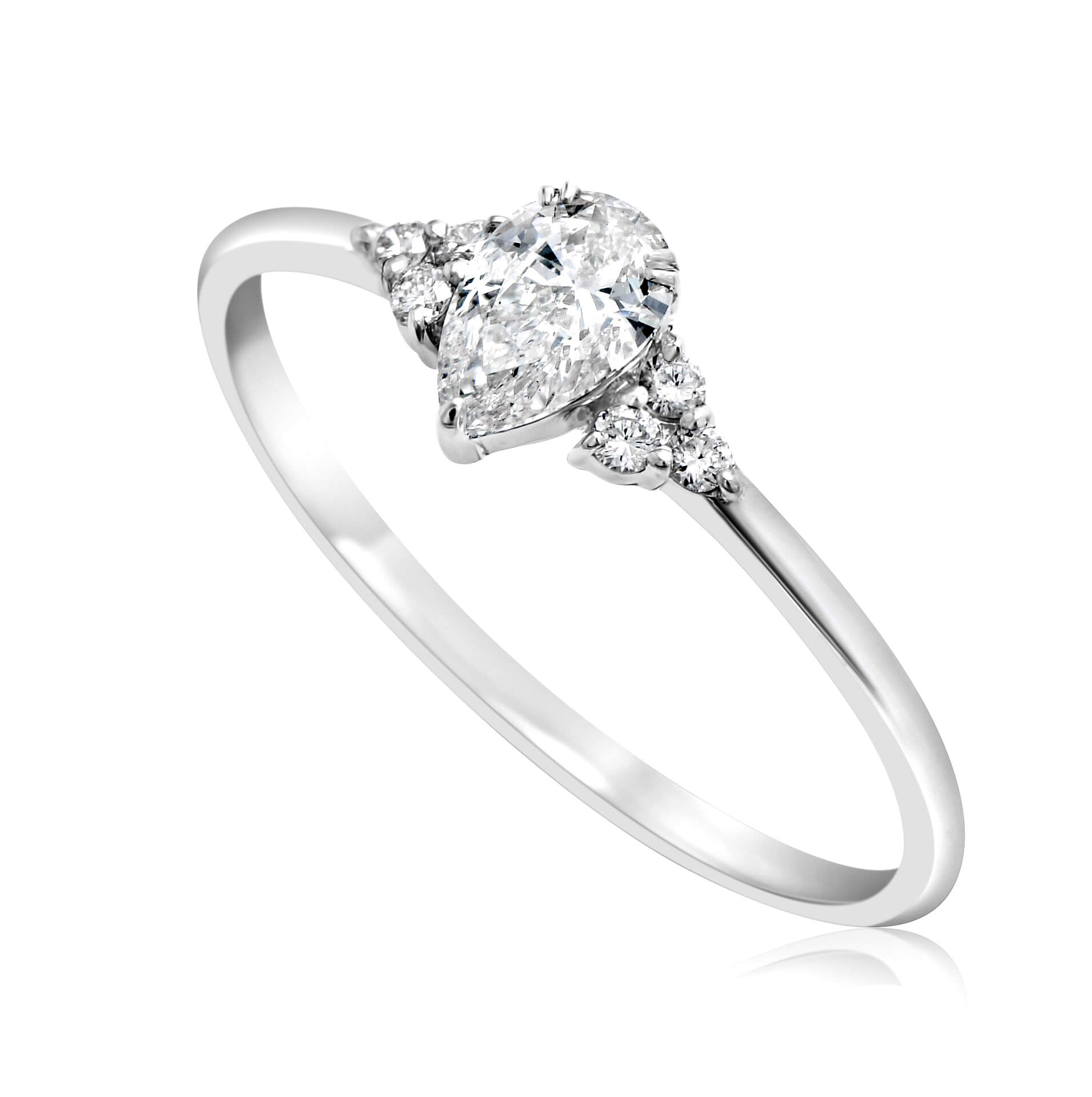 טבעת אירוסין קלאסית ואלגנטית, משובצת יהלומי מעבדה lab grown 14K. היהלום המרכזי בצורת טיפה מהודרת ועוד 6 יהלומי מעבדה עגולים משובצים 3 מכל צד