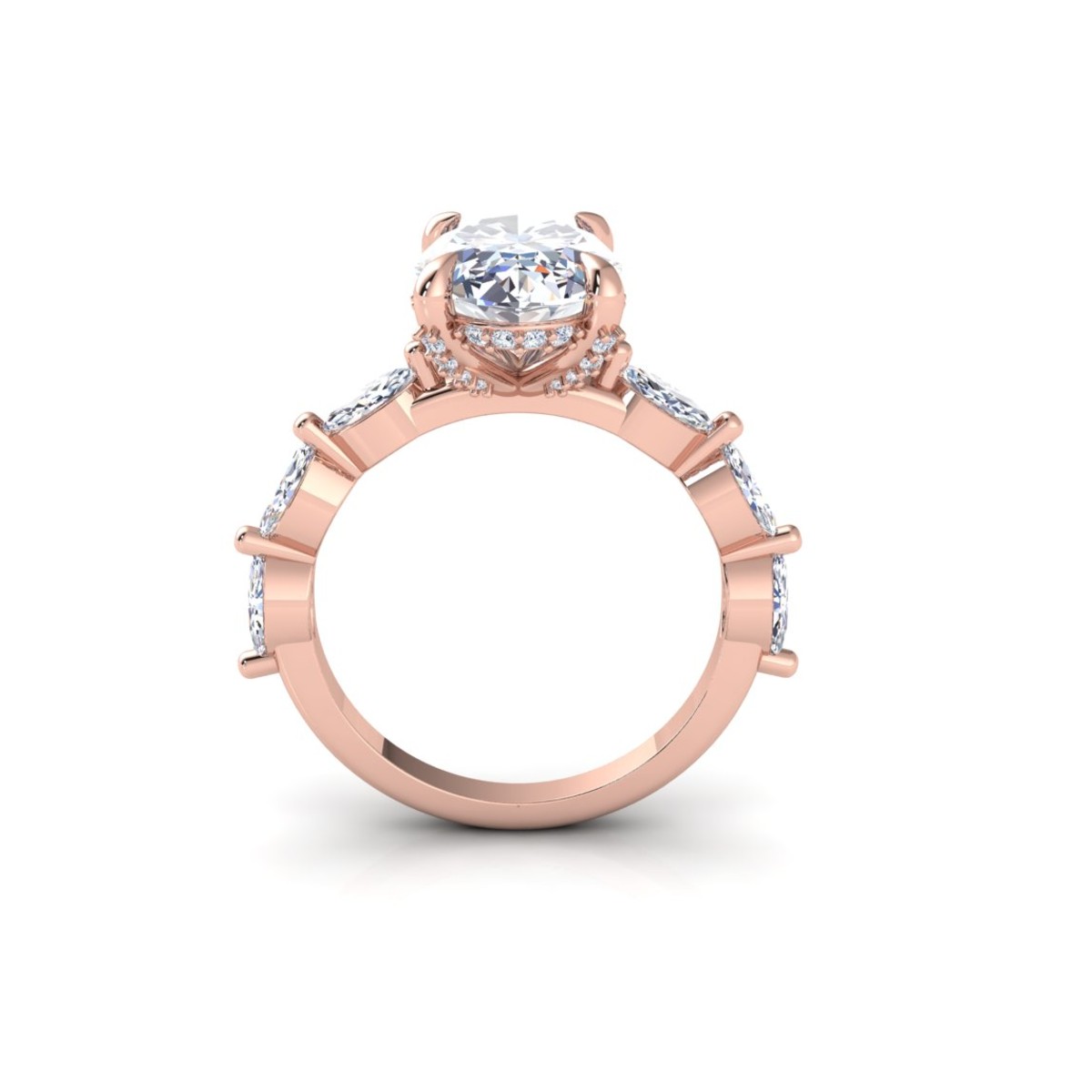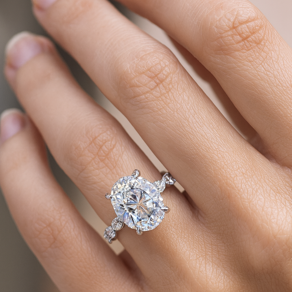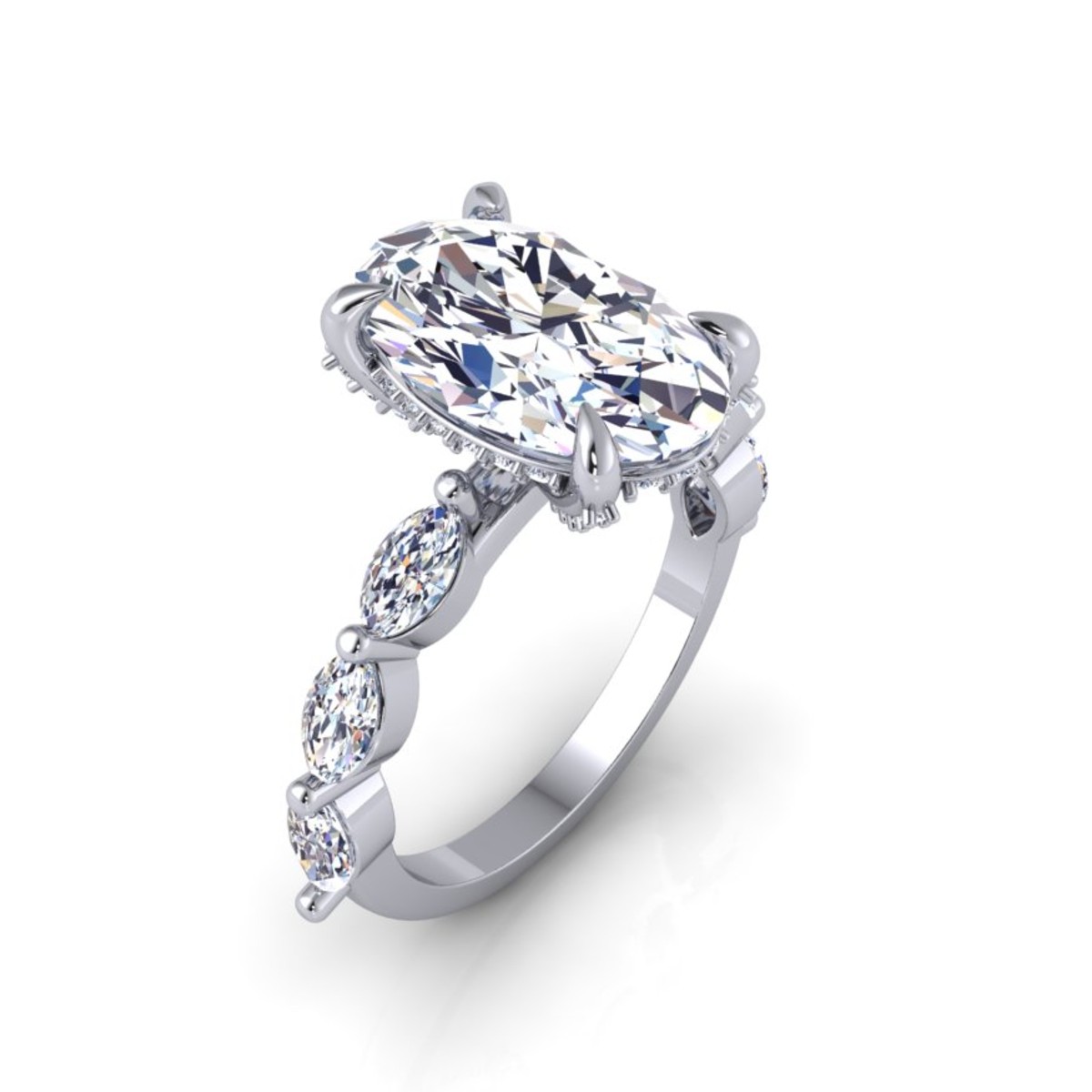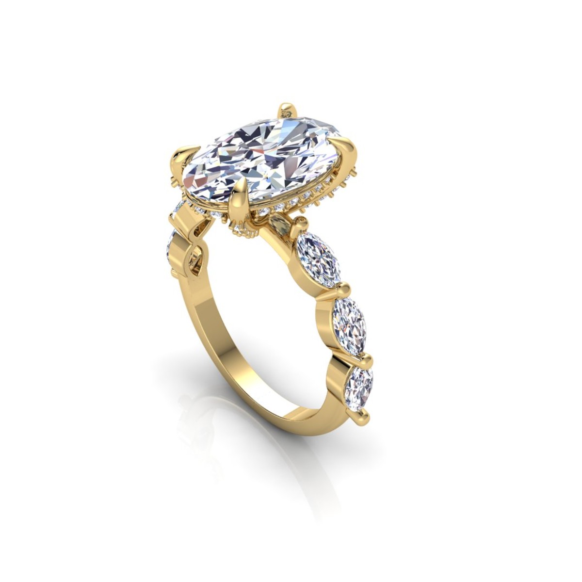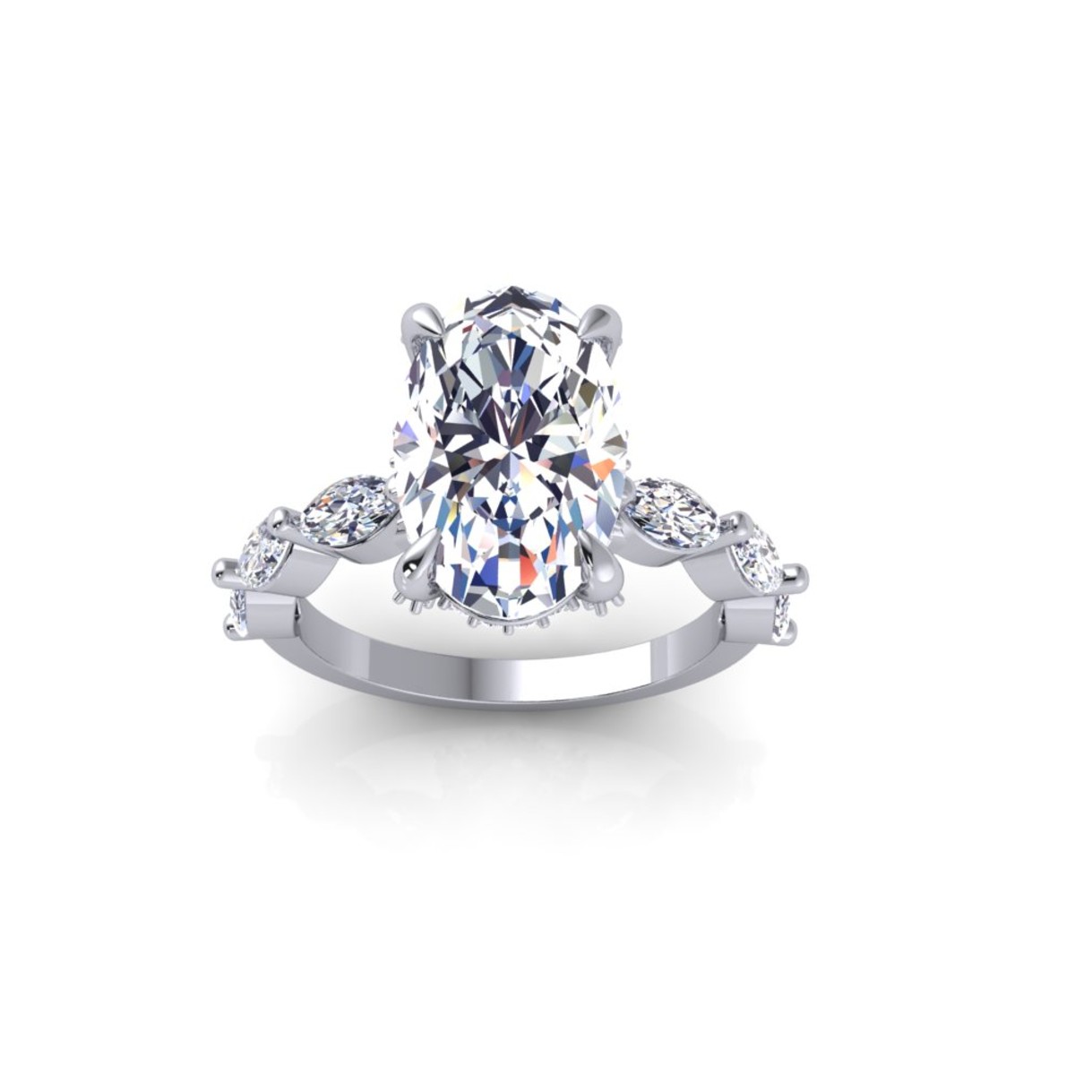 טבעת עם יהלום מרכזי בחיתוך "אובל" ושלושה יהלומים מכל צד.