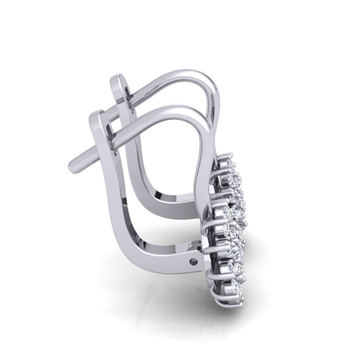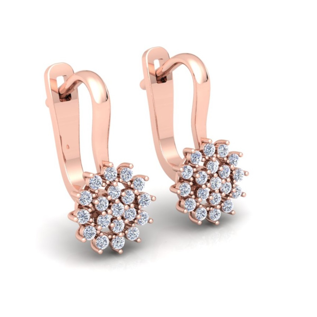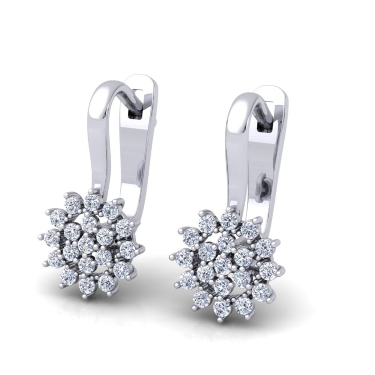 כל עגיל מעוטר בצורת פרח העשוי מיהלומים קטנים, המסודרים בצורה מעגלית בצפיפות גבוהה.