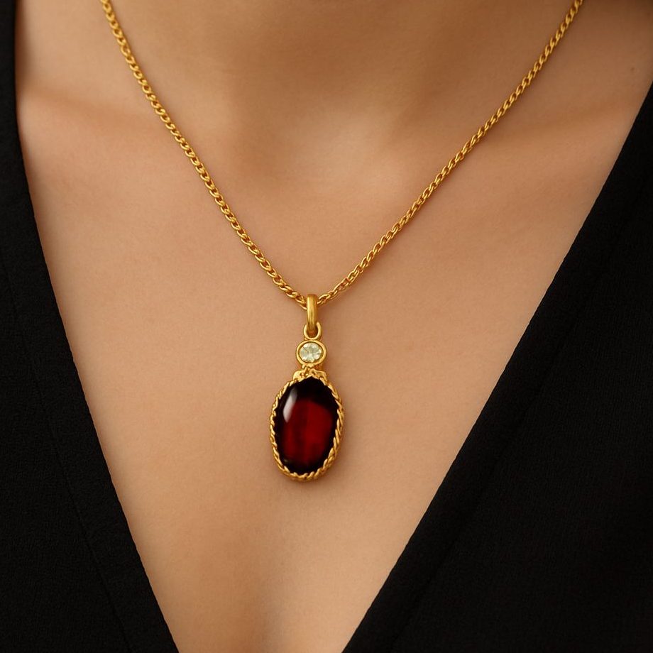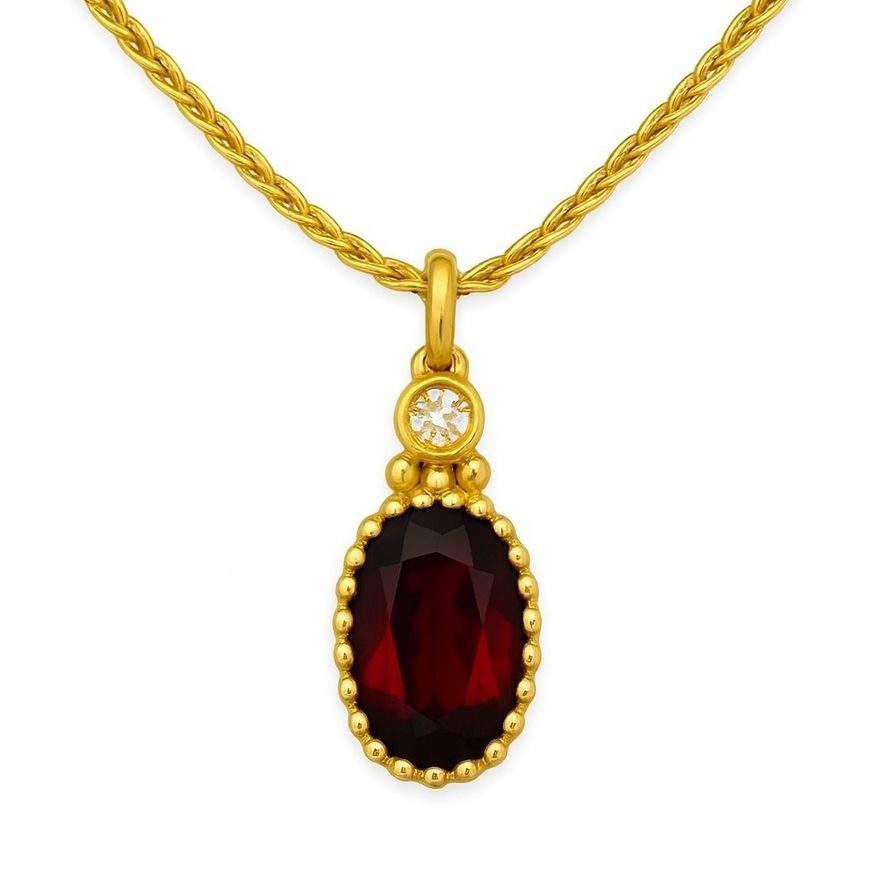 תליון אובל אבן חן אדומה, המשובצת במסגרת מעוטרת. מעל האבן האדומה משובצת יהלום. תליון אלגנטי ויפה בעיצוב וינטג'.