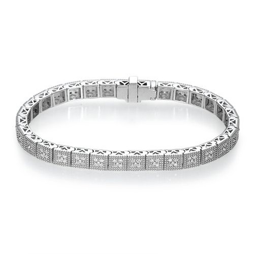 צמיד טניס יוקרתי. הצמיד מעוטר בשורת יהלומים בחיתוך "פרינסס", שכל אחת מהן מכוסה ביהלומים קטנים משובצים. העיצוב קלאסי ומעודן, עם סגירה בטיחותית להבטחת יציבות הצמיד.
