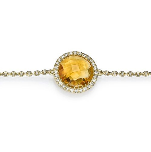 צמיד עדין עם שרשרת זהב דקה ואבן חן עגולה בגוון כתום . האבן המרכזית משובצת במסגרת של יהלומים קטנים שמוסיפים לה ברק.