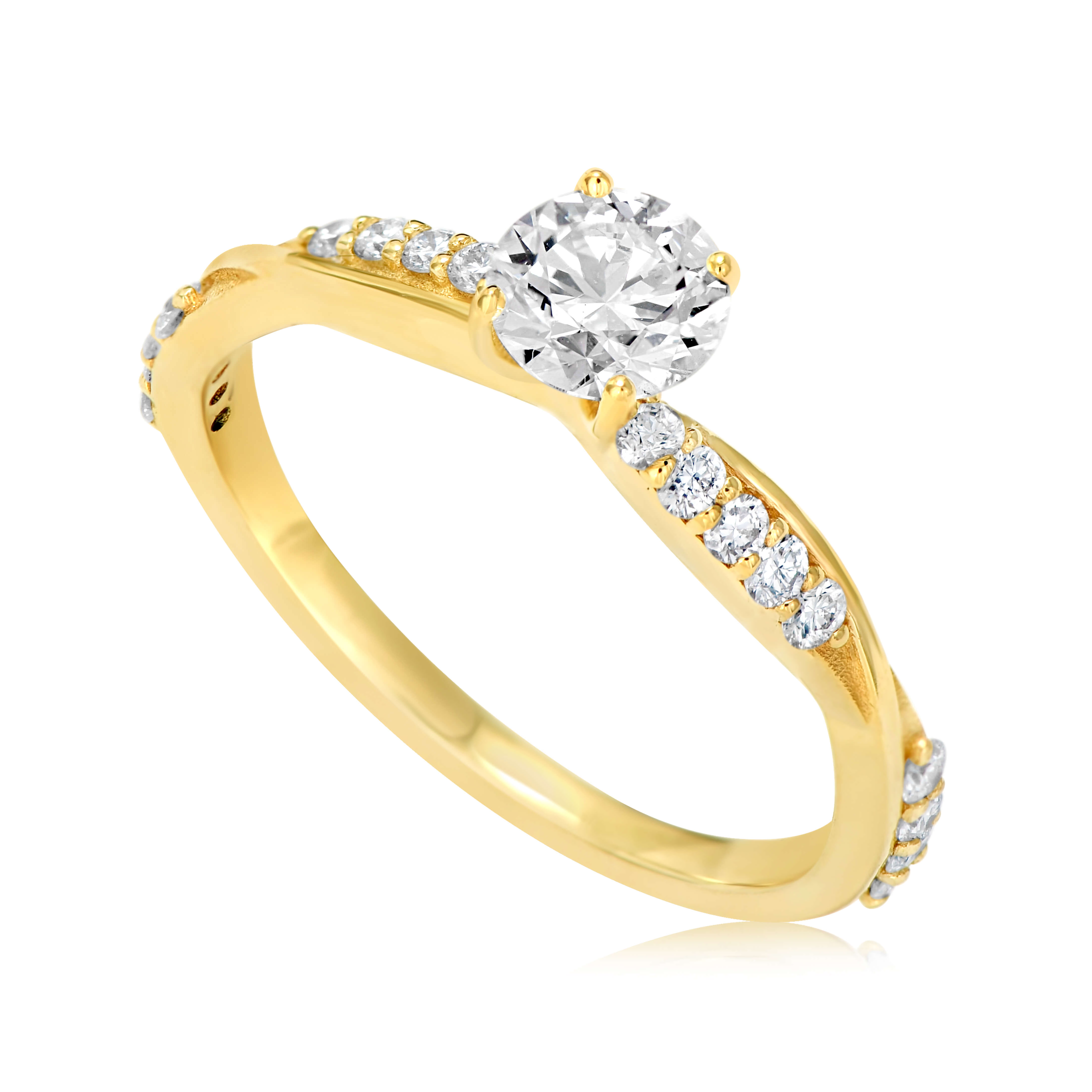 טבעת זהב משובצת יהלום מעבדה מרכזי עגול מלכותי מעוטר ביהלומי מעבדה עגולים נוצצים בטוויסט