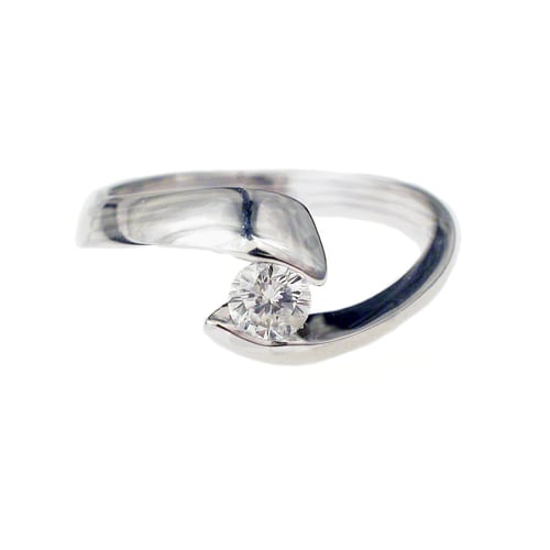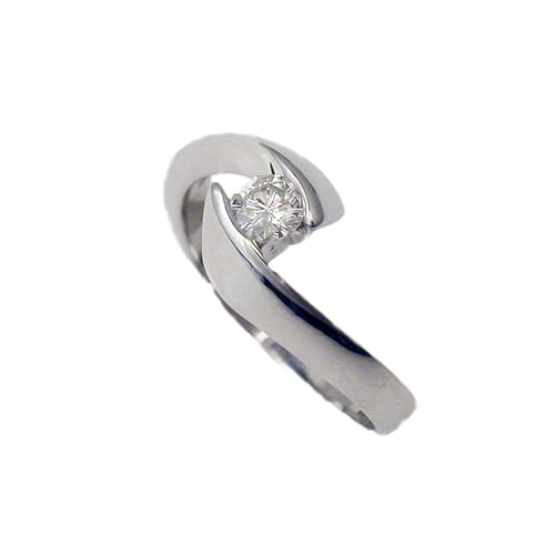 טבעת יהלום אלגנטית ויוקרתית, עיצוב הטבעת מודרני וייחודי, עם קו מתכת מתעקל בעדינות סביב האצבע ונפגש בחלקו העליון, שם משובץ יהלום עגול.