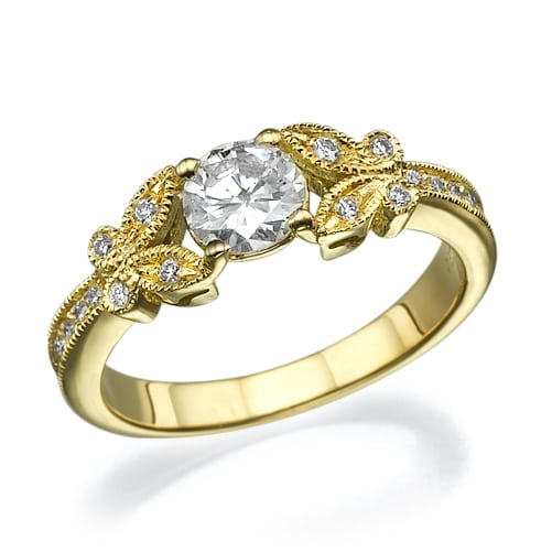 טבעת עם יהלום מרכזי עגול ומשני צידי היהלום עיצוב פרחוני המעוטר ביהלומים קטנים ועגולים המוסיפים לטבעת.