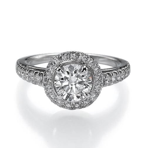 טבעת עם יהלום מרכזי עגול ומסגרת צפופה של יהלומים קטנים המקיפה את היהלום המרכזי, מה שמעניק לו מראה גדול וזוהר יותר.