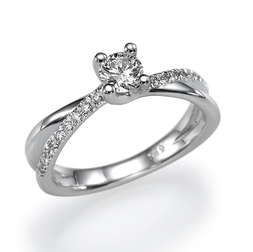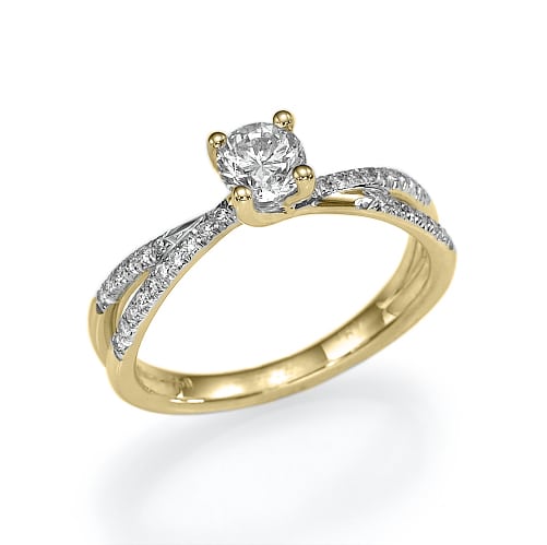 טבעת עם יהלום מרכזי . הטבעת כוללת עיצוב מפוצל של שתי זרועות ובהם יהלומים משובצים.