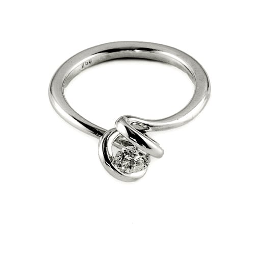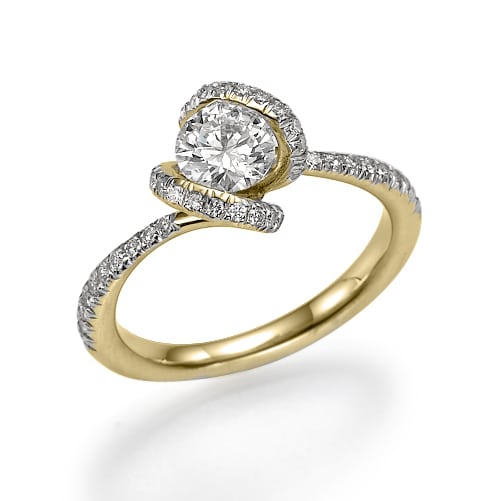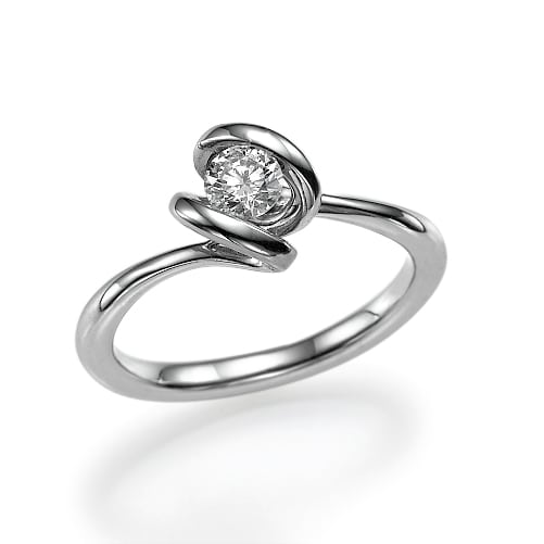 טבעת עם יהלום עגול גדול, משובצת במסגרת מפותלת .