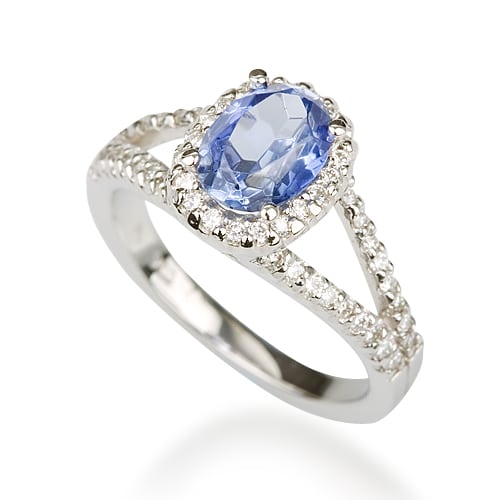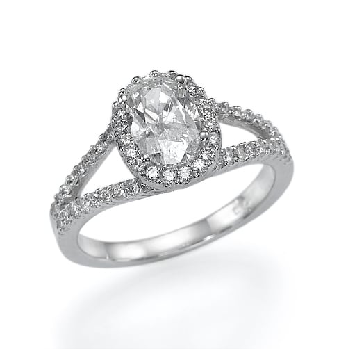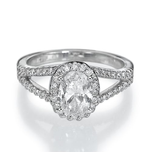סביב היהלום המרכזי ישנה מסגרת של יהלומים קטנים, המסגרת של הטבעת מתפצלת לשני חלקים עדינים,