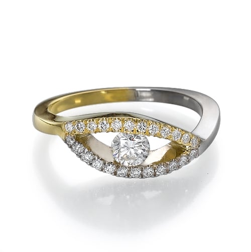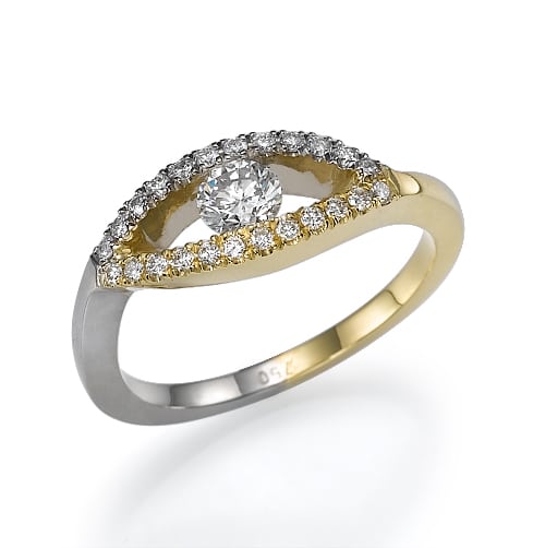 טבעת דמוי של "עין" משובצת יהלומים סביב המסגרת עם יהלום מרכזי עגול .