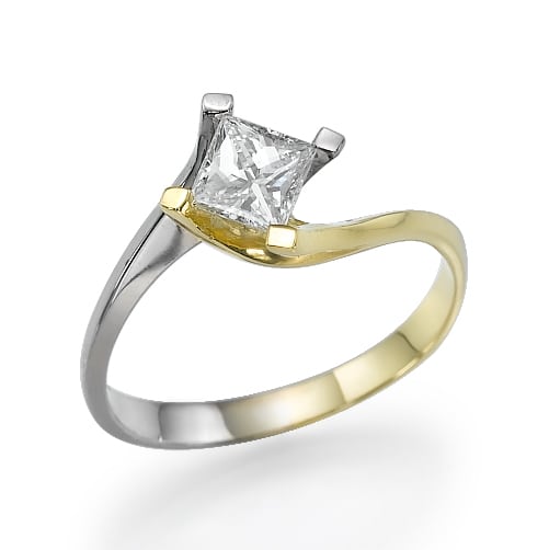טבעת עם יהלום בחיתוך "פרינסס" משולבת עם טוויסט חצי צבע זהב לבן חצי זהב צהוב .טבעת מיוחדת שמראה אלגנטיות.