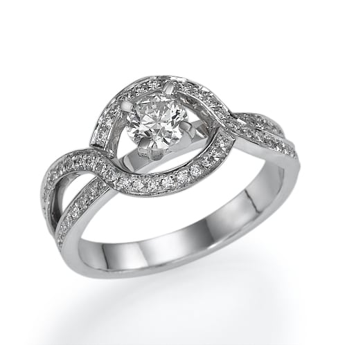 טבעת עם יהלום מרכזי עגול ויהלומים לאורך הרצועה המתפתלת שילוב של אלגנטיות עם תחכום, ומראה לטבעת מראה יוקרתי ונוצץ.