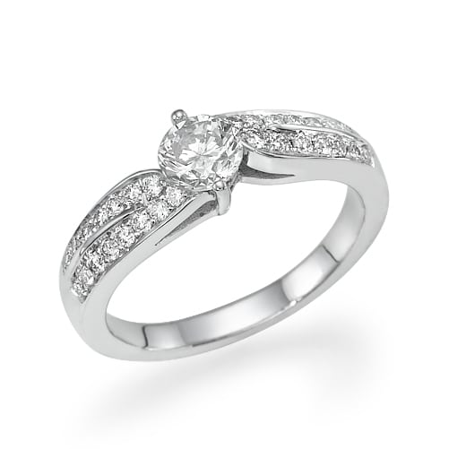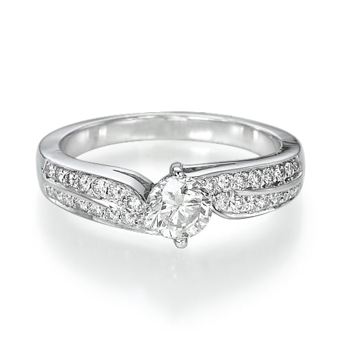טבעת עם יהלום מרכזי. המסגרת מתפצלת לכיוון היהלום המרכזי ומשובצת בשורות של יהלומים קטנים, מה שמעניק לה מראה יוקרתי ומרשים.