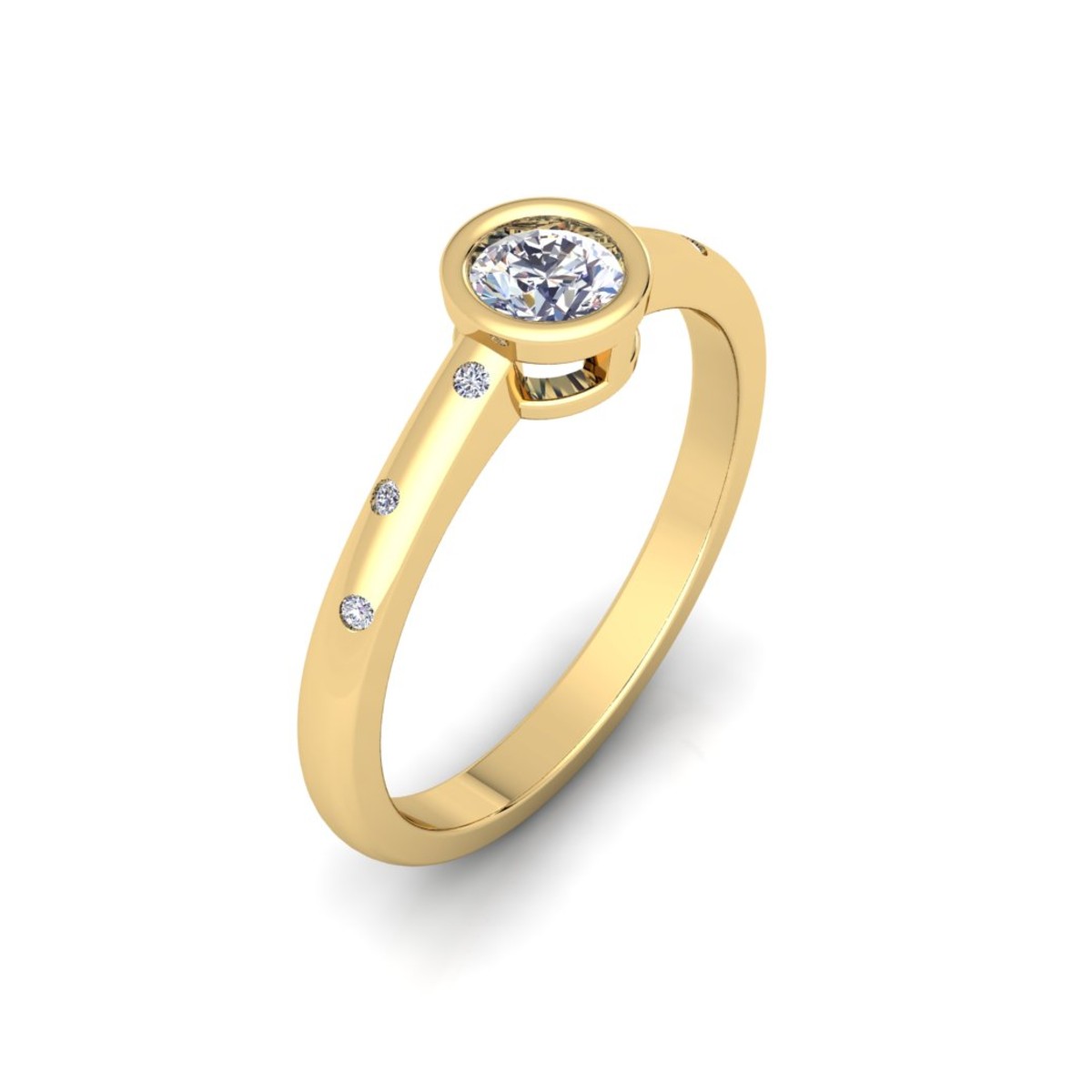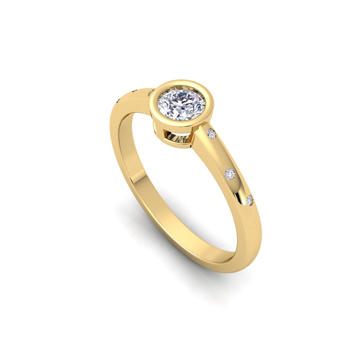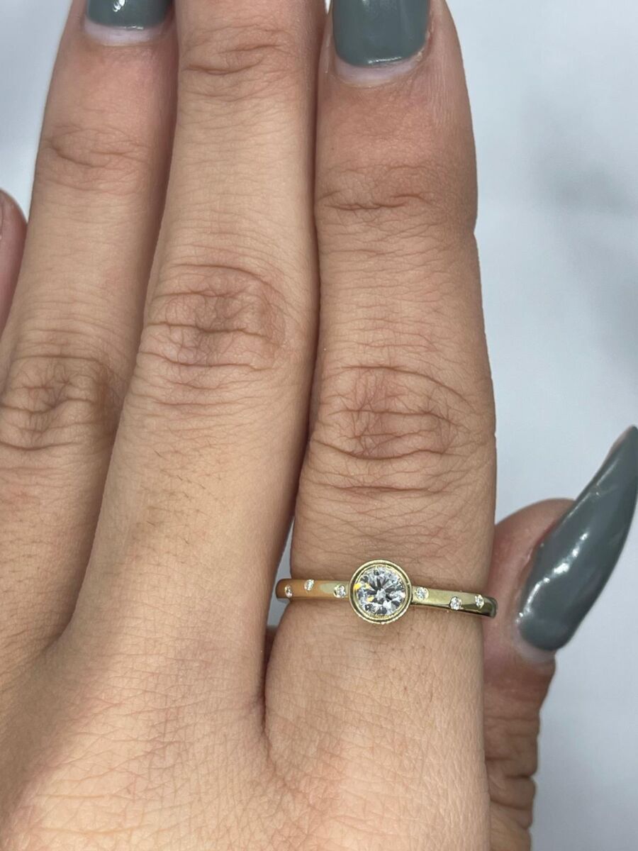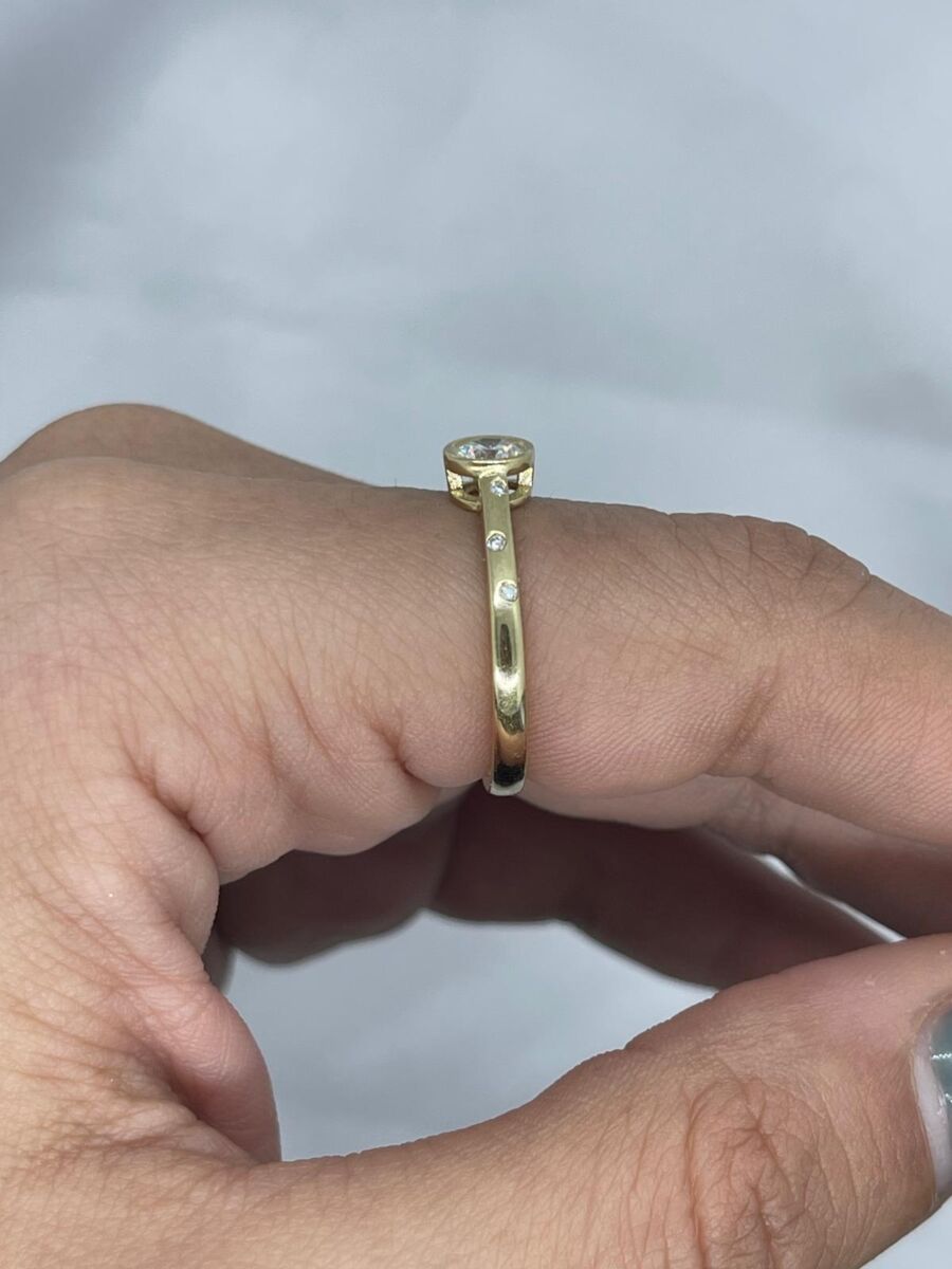 טבעת עם יהלום מרכזי קטן ועגול עם שלושה יהלומים קטנים משובצים מכל צד. טבעת חדשנית ויפייפיה ביופיה.
