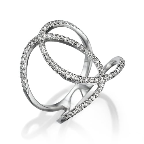 טבעת עם עיצוב המבוסס על קווים גאומטריים מעוגלים שיוצרים מעין צורת אינסוף . המסגרת משובצת יהלומים המעניקים לה תחושת קלילות.