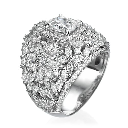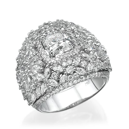 טבעת עם יהלום מרכזי ויהלומים רבים משובצים סביב היהלום.