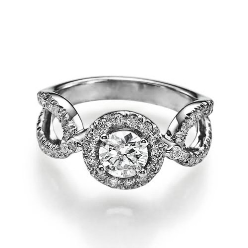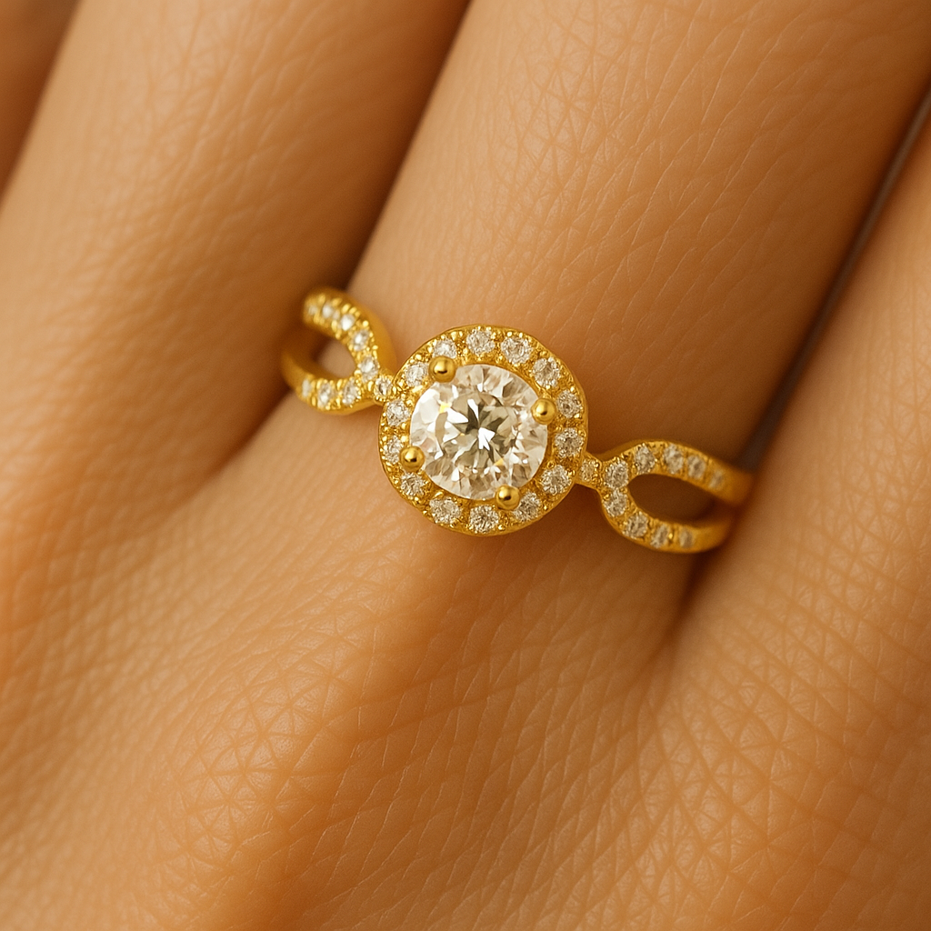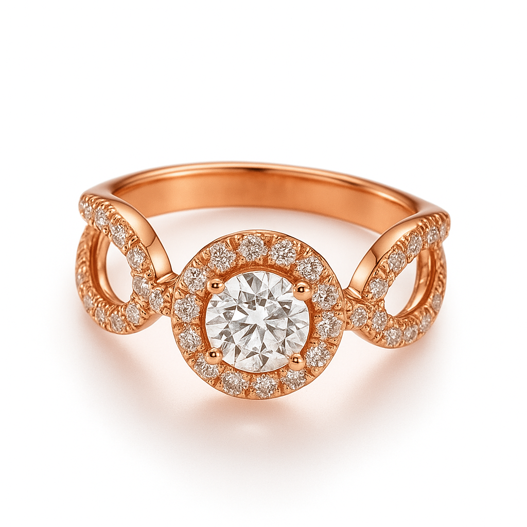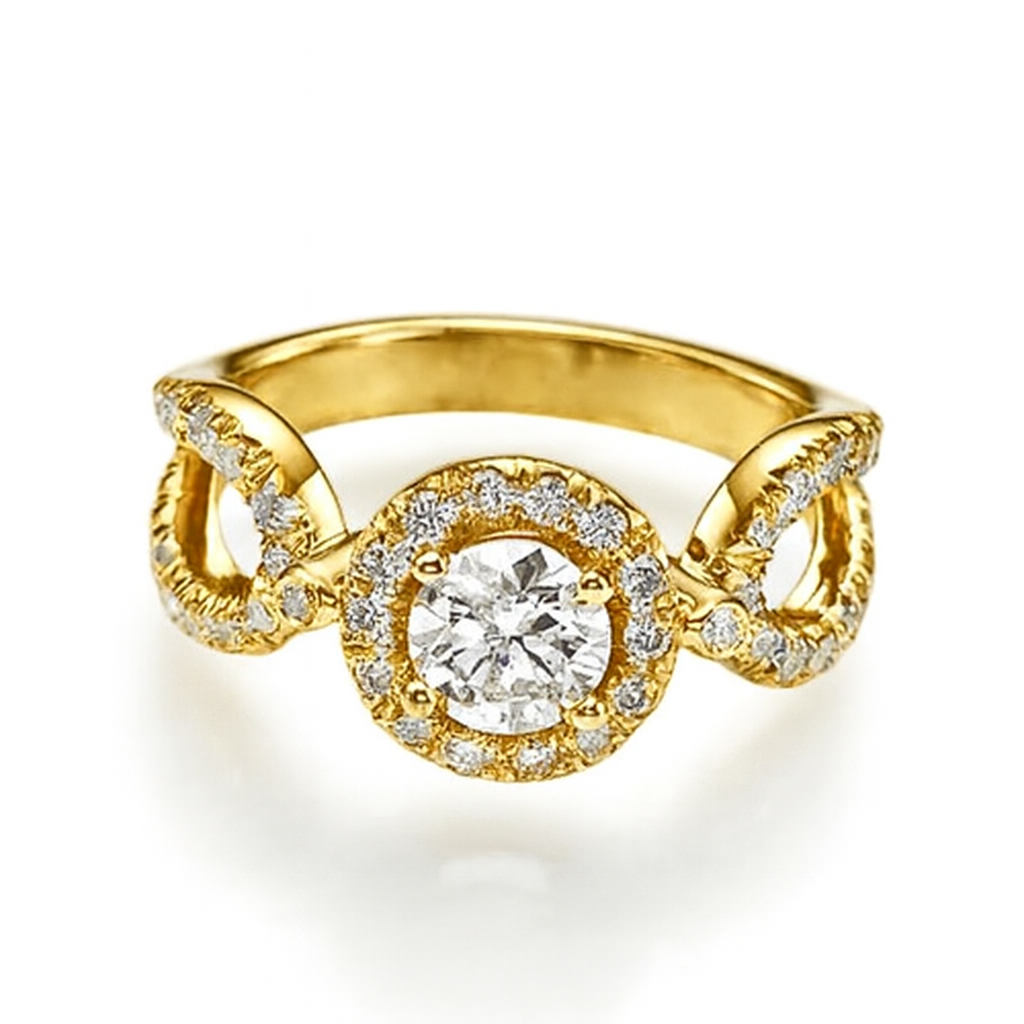 טבעת עם יהלום עגול, מוקף ביהלומים קטנים יותר.
