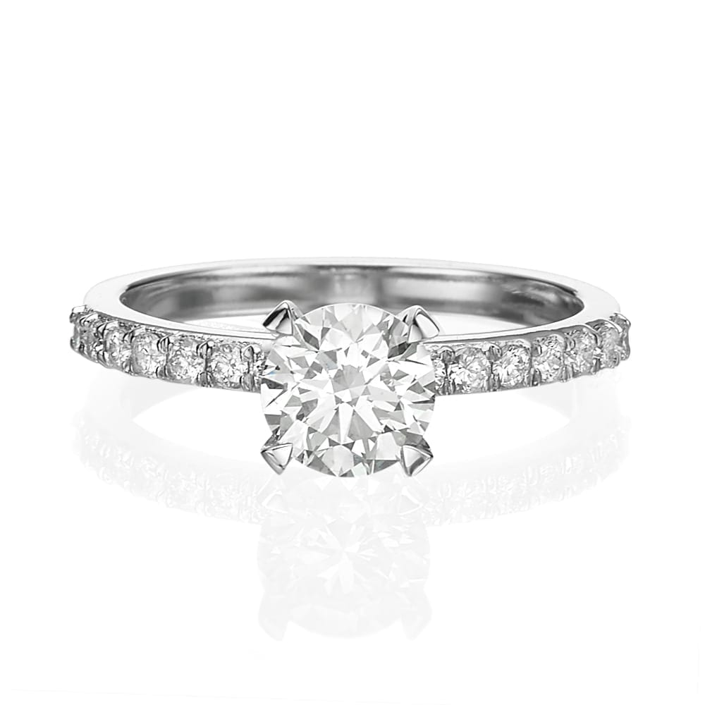 טבעת יהלומים קלאסית ומרשימה, משובצת יהלום מרכזי ושורת יהלומי צד.