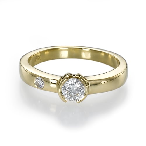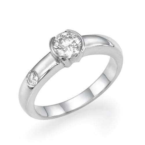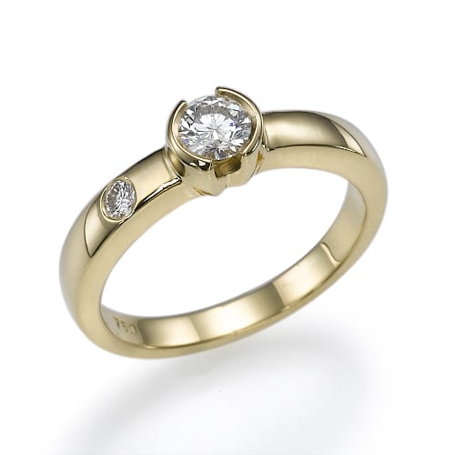 טבעת עם יהלום מרכזי עגול, בצד המסגרת של הטבעת משובץ יהלום קטן נוסף, המוסיף אלגנטיות לעיצוב.
