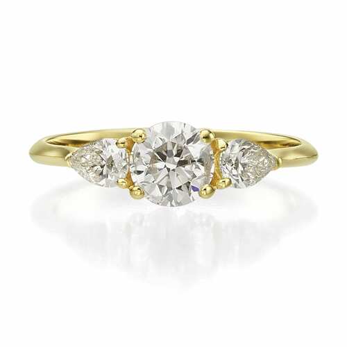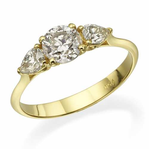 טבעת "מלכותית" עם יהלום מרכזי עגול ויהלומי טיפה בצד. מתאים כמתנה לאישה.