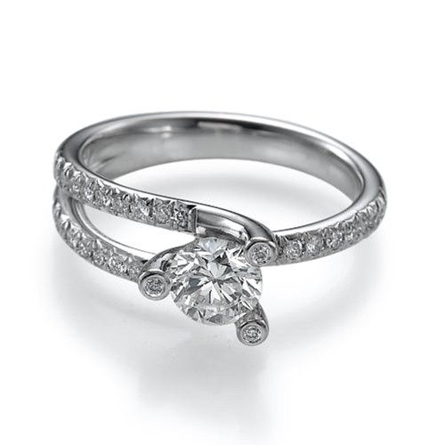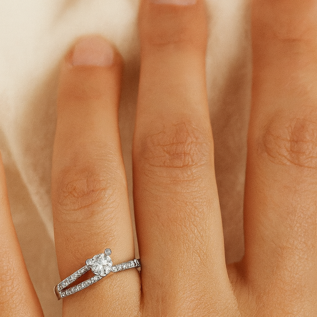 העיצוב כולל בסיס מפוצל עם יהלומי צד. המסגרת יוצרת אפקט של פתיחה עדינה סביב היהלום המרכזי.