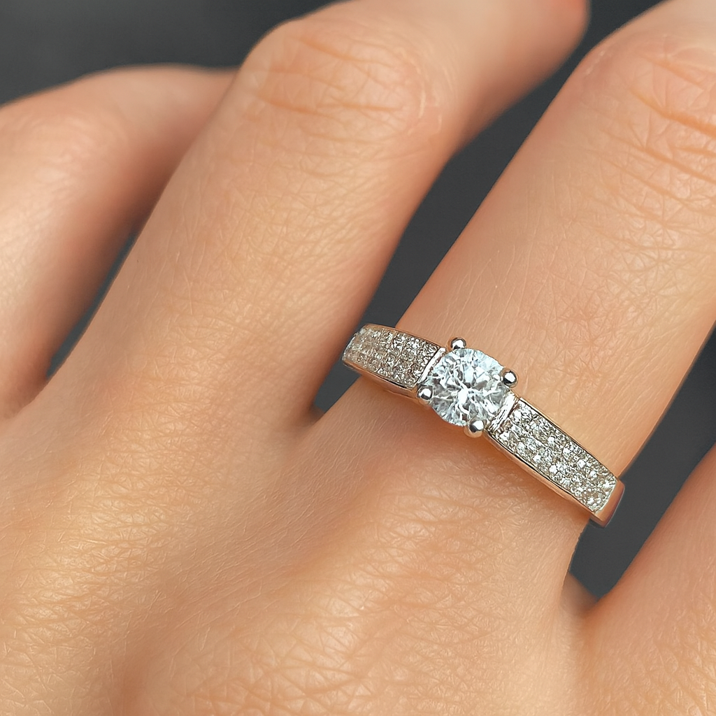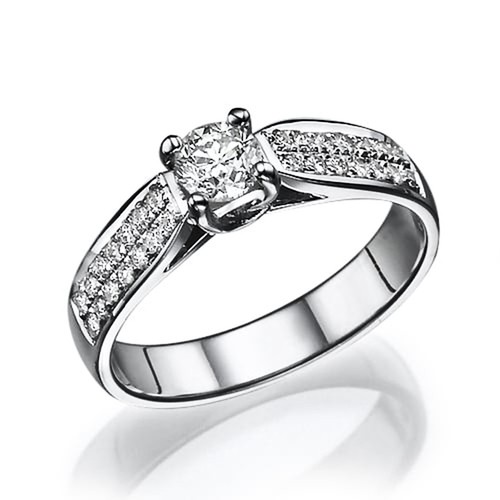 טבעת עם יהלום מרכזי עגול ושני שורות של יהלומי צד. טבעת אצילית ומרשימה.