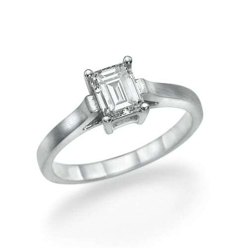 טבעת עם יהלום מרכזי בצורת "בגט" ומסגרת מט.
