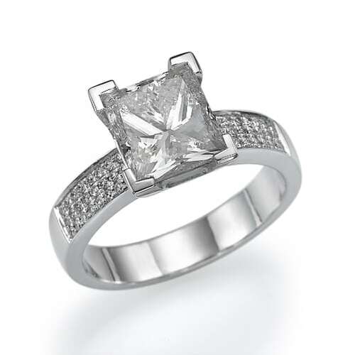 טבעת עם יהלום מרכזי בחיתוך "פרינסס" בולט במיוחד. ויהלומי צד עגולים צפופים. מתאים למי שאוהבת טבעת
