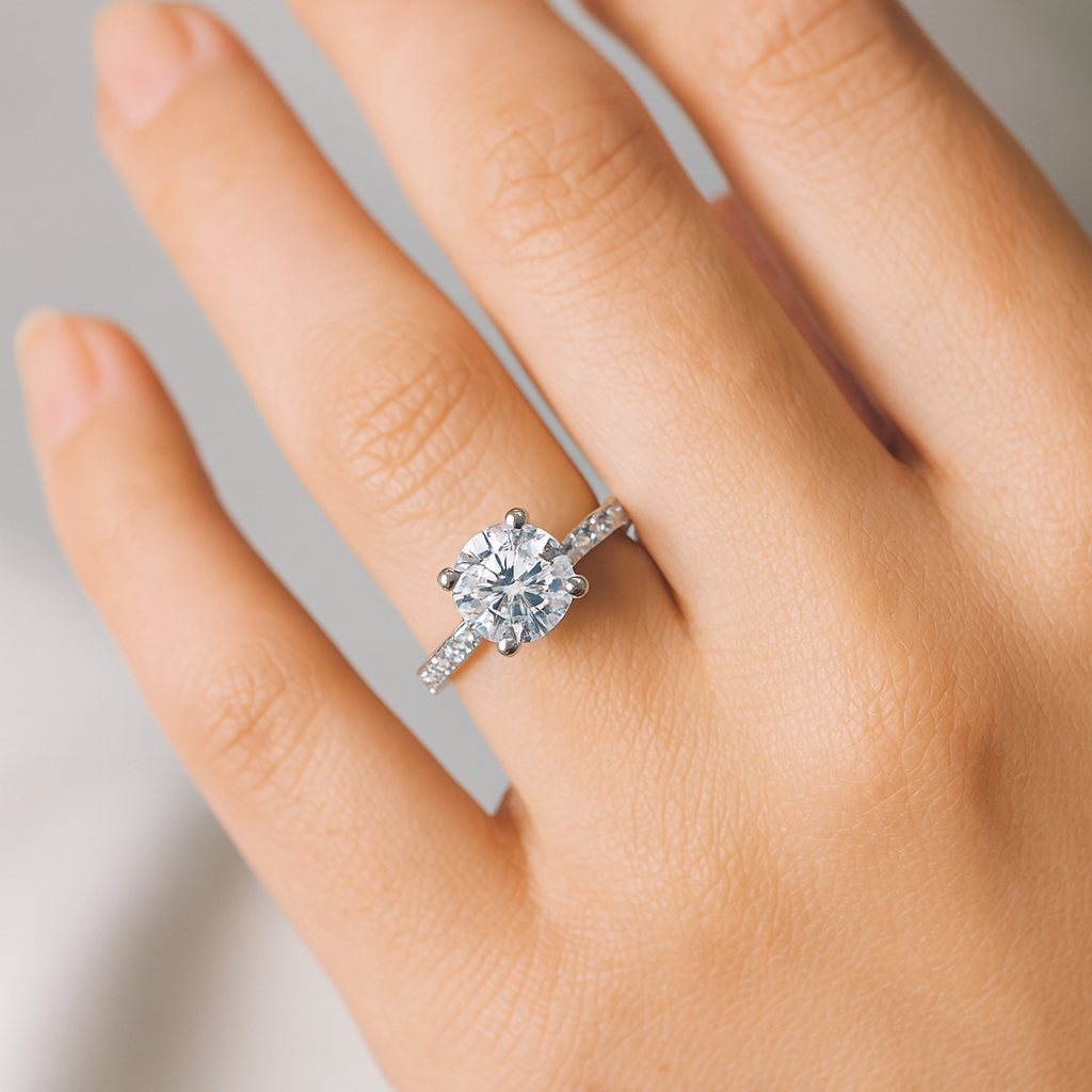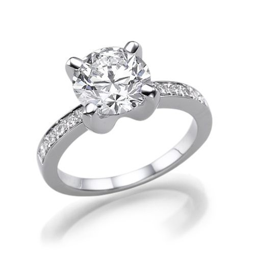 טבעת עם יהלום מרכזי עגול ומצדידה יהלומים קטנים. מרשימה ואלגנטית.