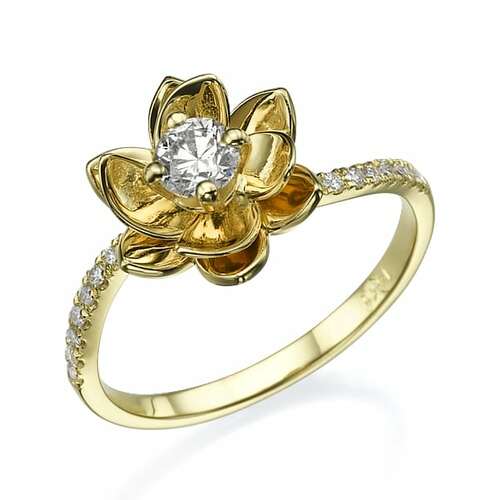 טבעת זהב יוקרתית בעלת עיצוב מרהיב בהשראת פרח . במרכז הפרח משובץ יהלום נוצץ, המעניק לטבעת מראה אלגנטי וזוהר. על גבי חישוק הטבעת משובצים יהלומים קטנים נוספים,