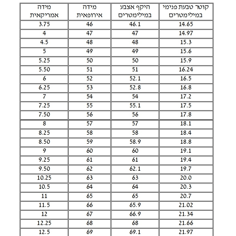 את המידה האמריקאית שיצאה לכם תתרגמו בטבלה בסוף העמוד למידה ישראלית – זאת המידה שאתם צריכים