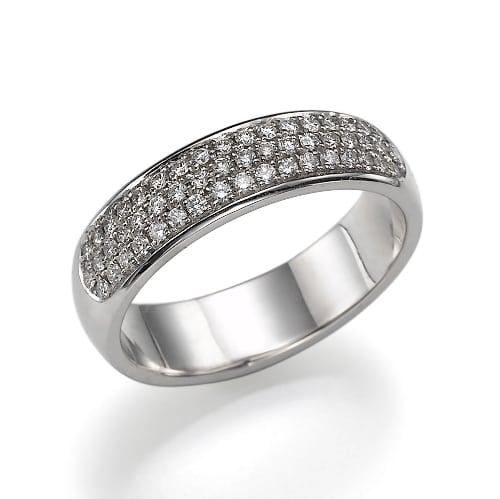 טבעת רחבה משובצת בשורות של יהלומים קטנים וצפופים לכל רוחב החלק העליון.