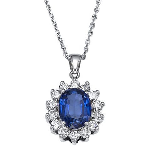 אבן חן כחולה בחיתוך אובל ומסביבה משובצת יהלומים, המשמש כמרכז העיצוב ומעניק לשרשרת מראה אצילי.