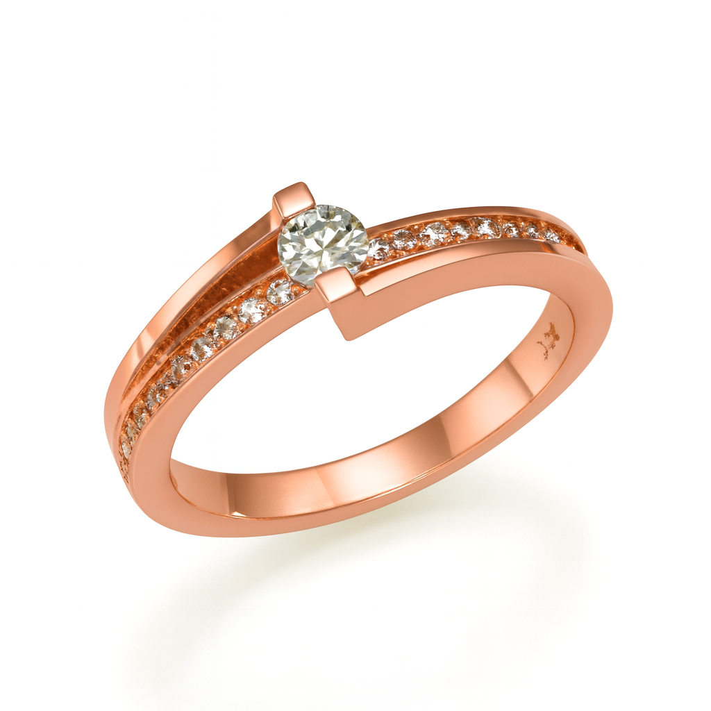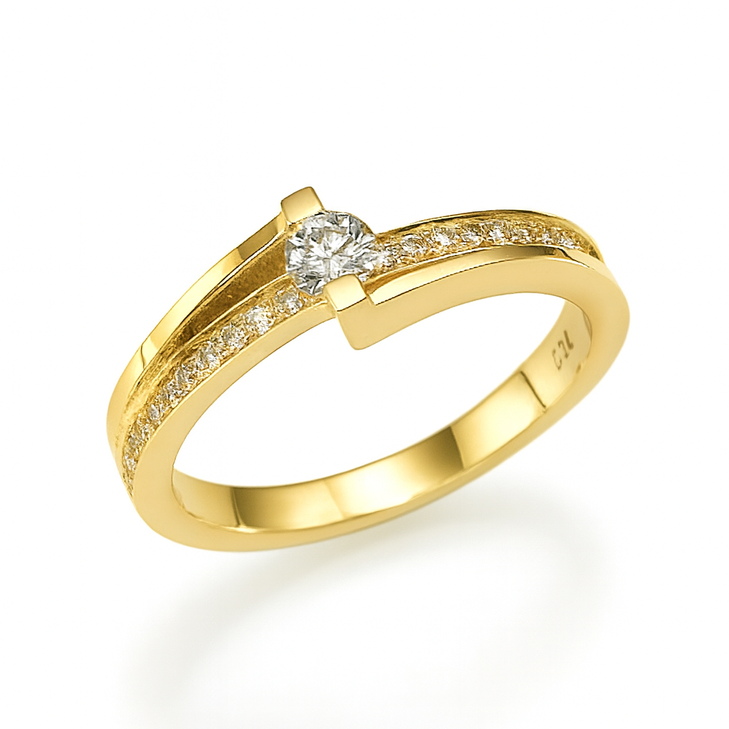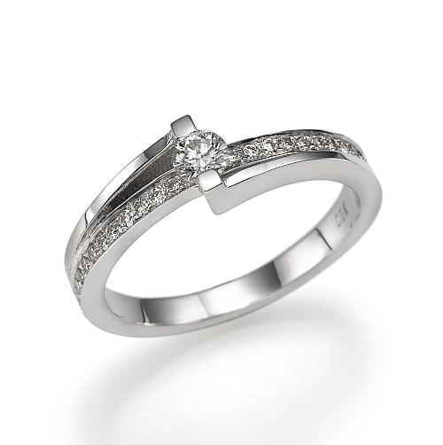 טבעת יהלום בעיצוב מודרני ואלגנטי. במרכזה משובץ יהלום עגול ובוהק, הנתמך על ידי שני פסים מתכתיים עדינים המשתלבים כחלק מהעיצוב. בצדי הטבעת, משובצים יהלומים קטנים בשיבוץ שורה, המוסיפים לה ברק וזוהר נוסף. השילוב בין האלגנטיות הקלאסית למבנה הייחודי הופך אותה לבחירה מושלמת לטבעת אירוסין יוצאת דופן.