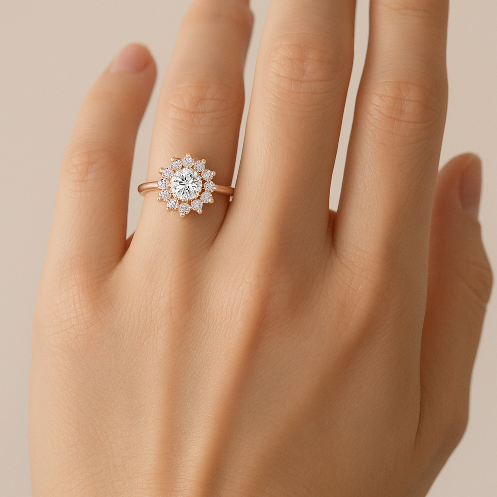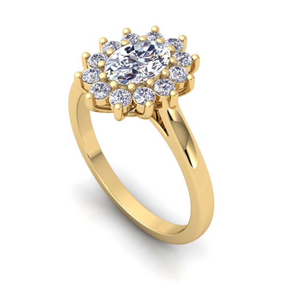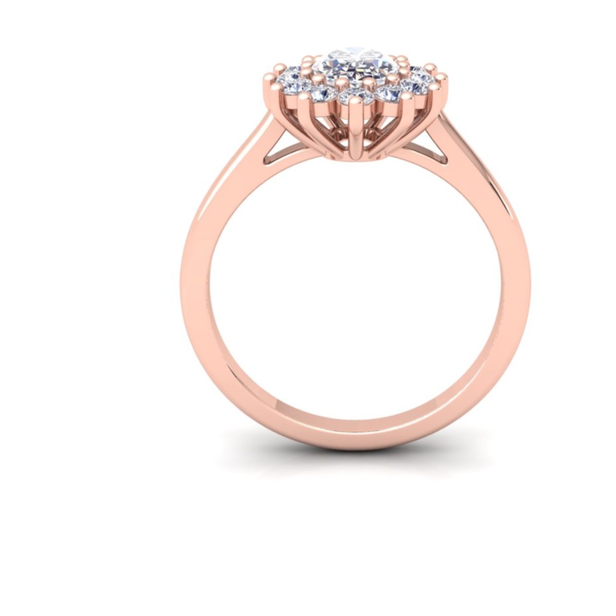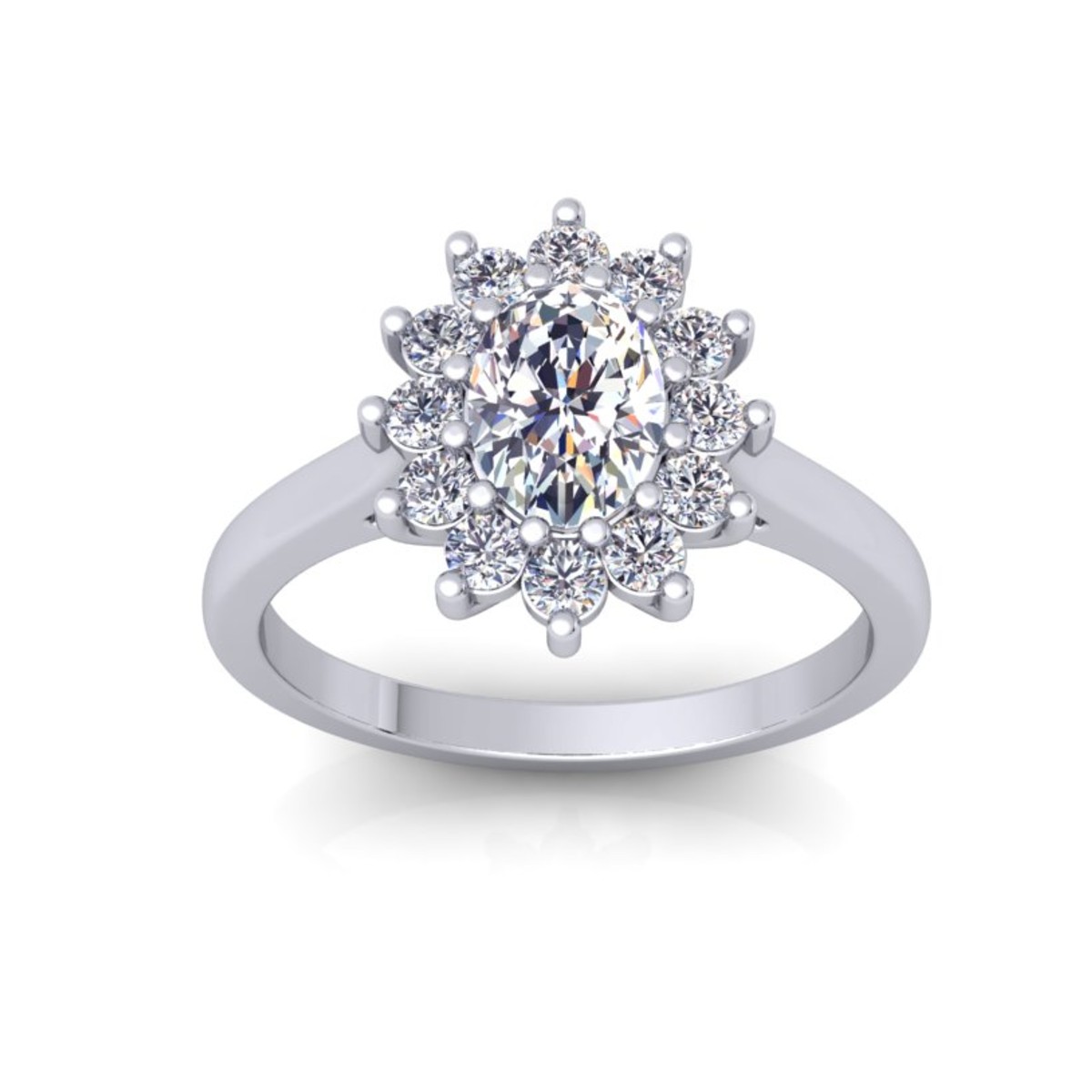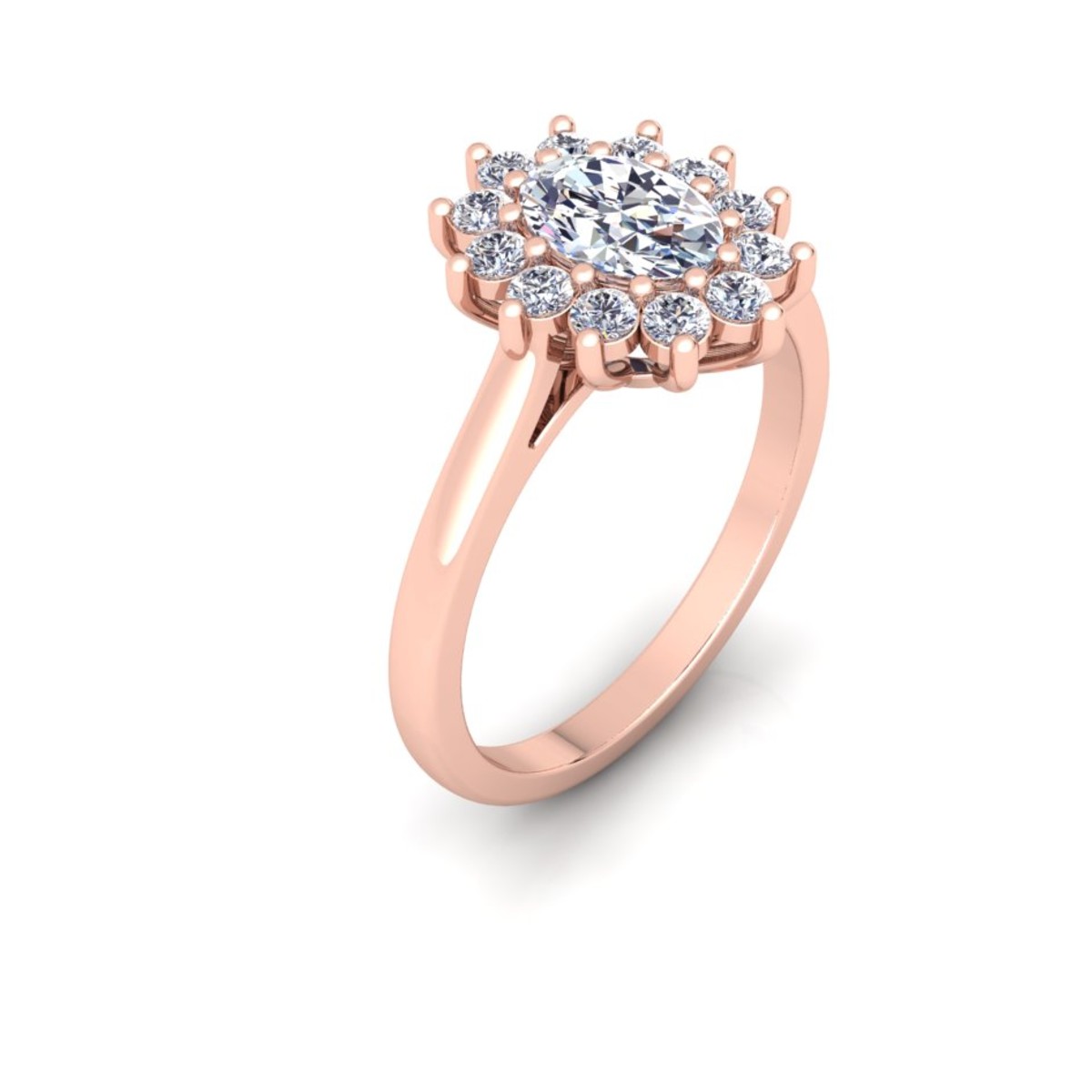 טבעת עם יהלום מרכזי אובל, היהלום המרכזי מוקף ביהלומים קטנים יותר בדמוי פרח.