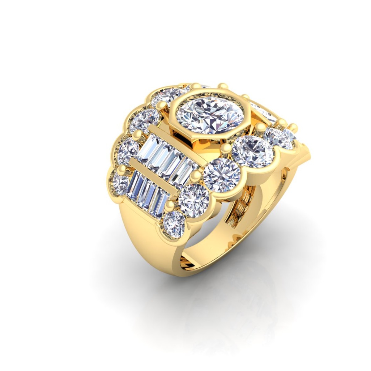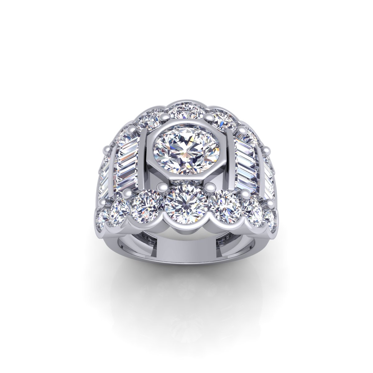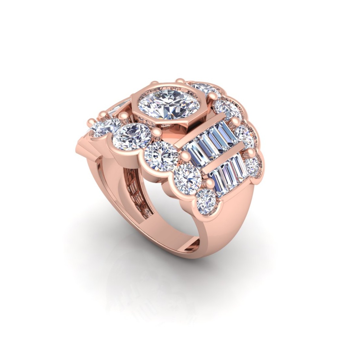 וסביבו, משובצים יהלומים עגולים קטנים ובשני צידי הטבעת משובצים יהלומים בחיתוך באגט .